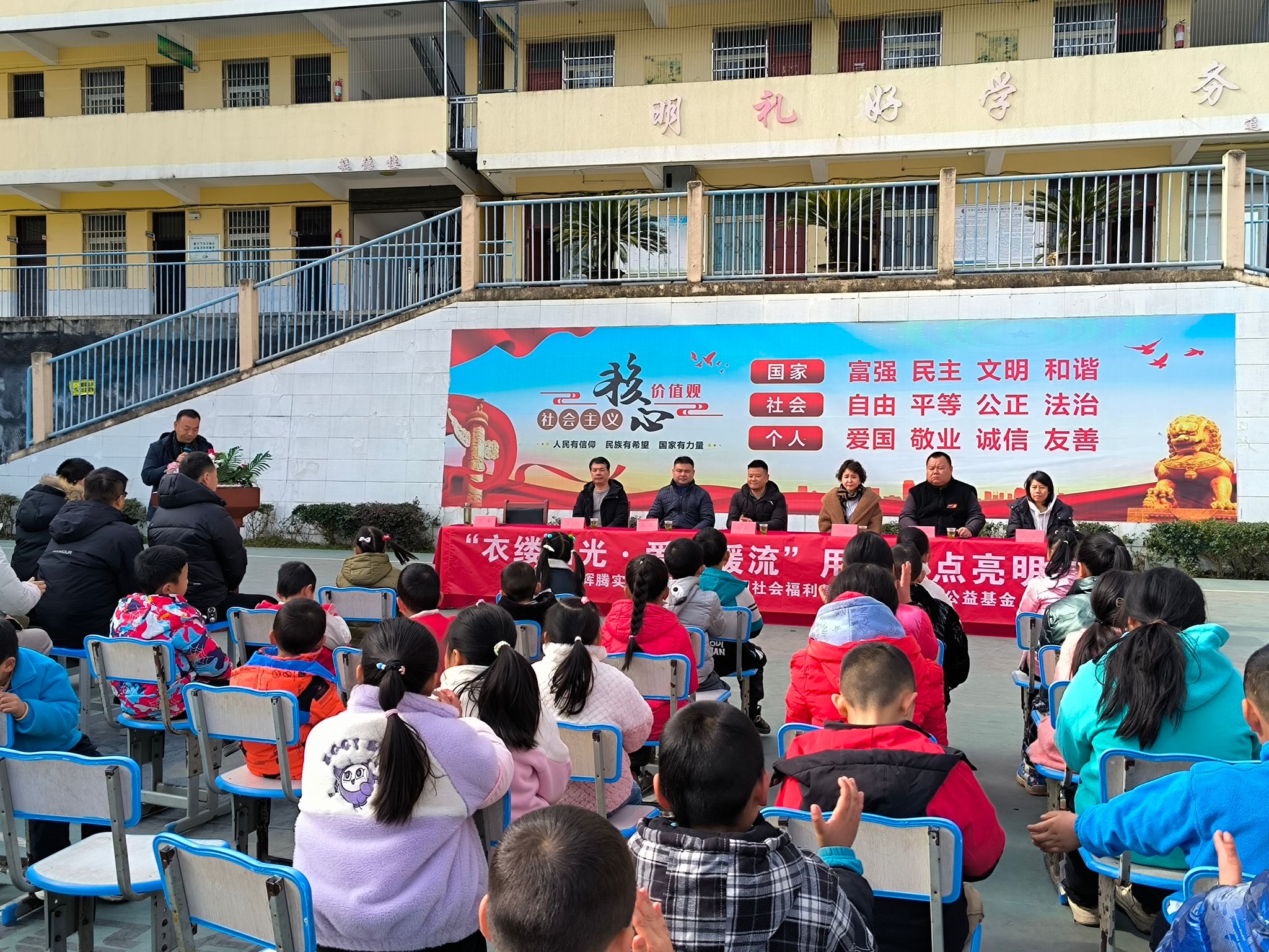 本网讯 为了让孩子们温暖过冬,安心学习,1月17日,我校乡村振兴驻村工作队携手中国社会福利基金会暖流计划公益基金东航驿站,在县河镇财梁九年制学校举行了冬装校服套装捐赠仪式。县河镇副镇长杨涛、组织委员王亚琪,我校乡村振兴驻村工作队、中国福利基金会工作人员及学校全体师生参加。